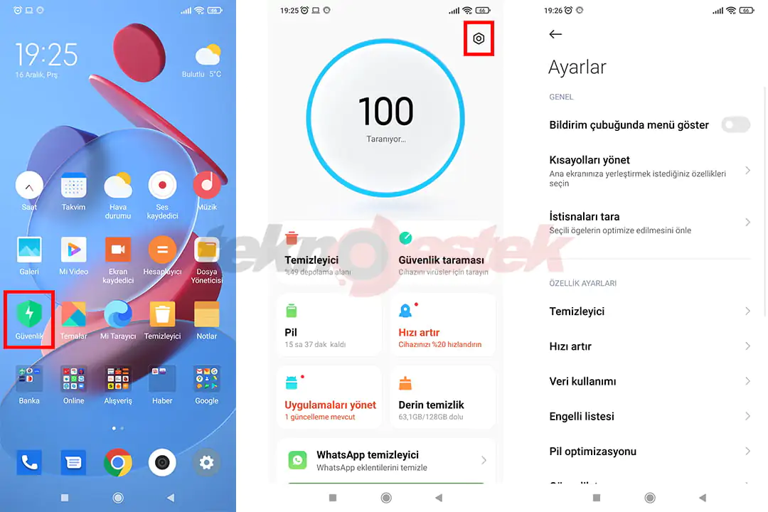 İlk olarak telefonunuzun ana ekranında yer alan “Güvenlik” uygulamasına giriş gerçekleştirelim. Karşınıza açılan güvenlik sayfasının sağ üst köşesinde yer alan “Ayarlar” simgesine tıklayalım. Karşınıza Ayarlar sayfası açılacaktır.