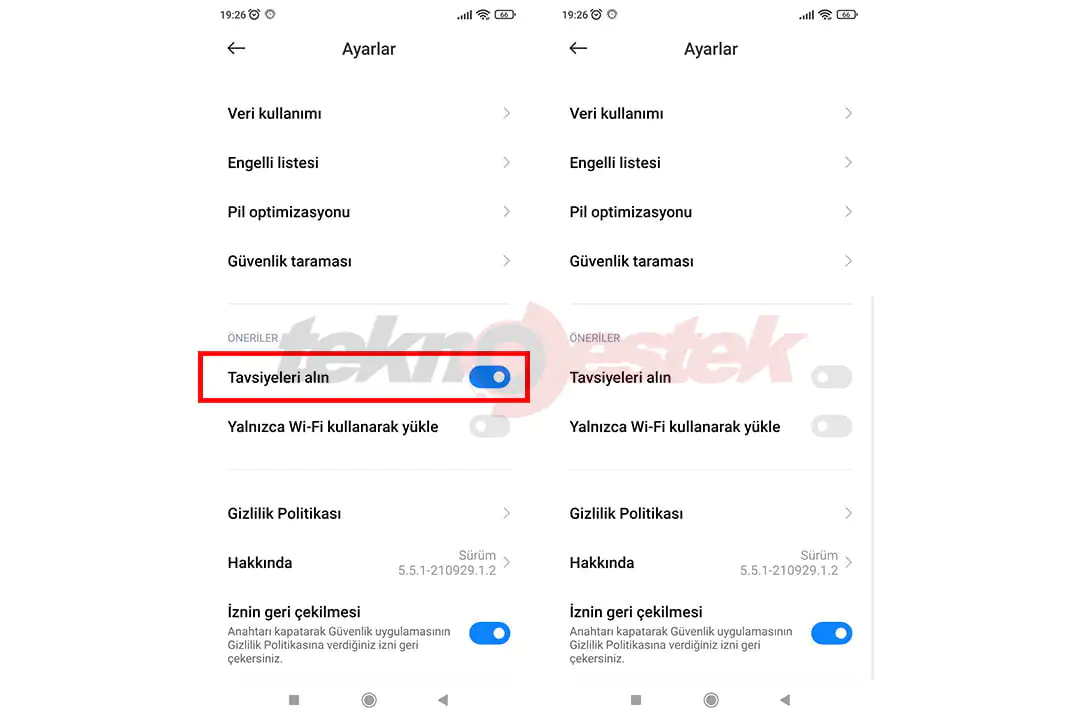 Güvenlik uygulaması içerisinde Öneriler nasıl kapatılır?