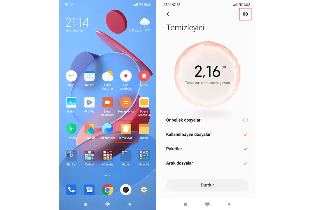 İlk olarak telefonunuzun ana ekranında yer alan “Temizleyici” uygulamasına giriş gerçekleştirelim. Karşınıza açılan Temizleyici sayfasının sağ üst köşesinde yer alan “Ayarlar” simgesine dokunalım.