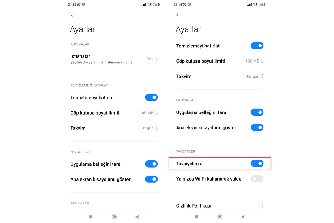 Temizleyici uygulaması içerisinde Öneriler nasıl kapatılır?