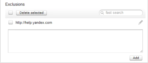 Dışlama listesinde, tüm site bölümlerini hariç tutmak için tam belge adreslerini veya maskelerini belirtebilirsiniz. Örneğin: Dışlama somepage.php üzerine example.com:http://example.com/somepage.php