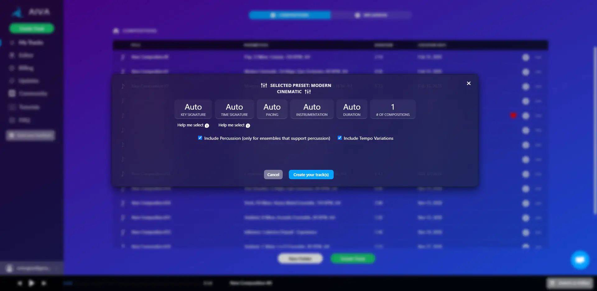 Aiva’nın kullanımı ise her yaştan kullanıcının zorlanmadan yapabileceği düzeyde. Siteye gidin, hesabınızı oluşturun ve “Create Track” butonuna tıklayın.