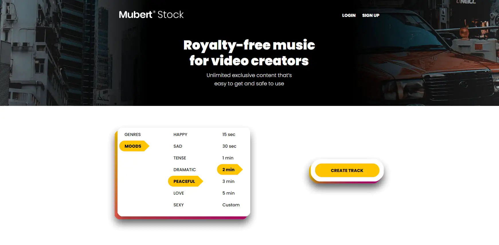 Buraya tıklayarak Mubert’e gidin. Müziğin türünü mü yoksa ruh halini mi ayarlayacağınızı seçin, ardından neyi seçtiğinize bağlı olarak türü veya ruh halini seçin, türün alt türünü ve süresini ayarladıktan sonra “Create Track” butonuna basın ve 30 saniye içinde müziğiniz hazır olsun!