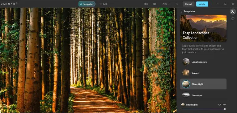 Bir şablon seçtikten sonra, pozlama, renk, ayrıntı ve diğer ayarları değiştirebilir veya şablon olmadan kendi ayarlarınıza dalabilir ve uygulayabilirsiniz. Luminar 4’te olduğu gibi, yazılım özellikle manzara ve portreler için tasarlanmış özellikler içerir. Luminar AI bağımsız olarak veya bir Photoshop eklentisi olarak çalışır. Skylum, 30 günlük para iade garantisi sunar, ancak ücretsiz deneme sunmaz.
