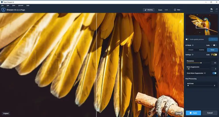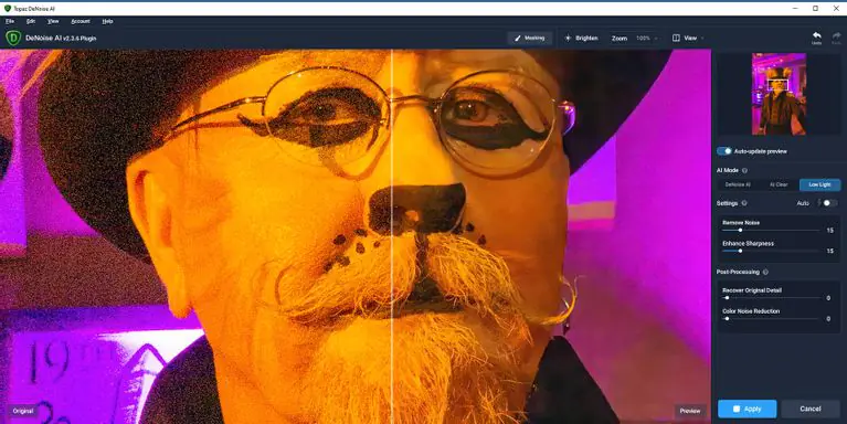 Önceki favorimiz olan Imagenomic’in Noiseware’ı da iyi bir iş çıkarıyor, ancak kontrollerle çok fazla uğraşmayı gerektiriyor. DeNoise AI tipik olarak bize yalnızca otomatik ayarlarla daha iyi sonuçlar — daha az gürültü ve daha fazla ayrıntı — verir. En büyük dezavantajı, diğer gürültü azaltma araçlarından daha yavaş olmasıdır. Diğer Topaz Labs yazılımlarında olduğu gibi, 30 günlük ücretsiz deneme için indirebilirsiniz.