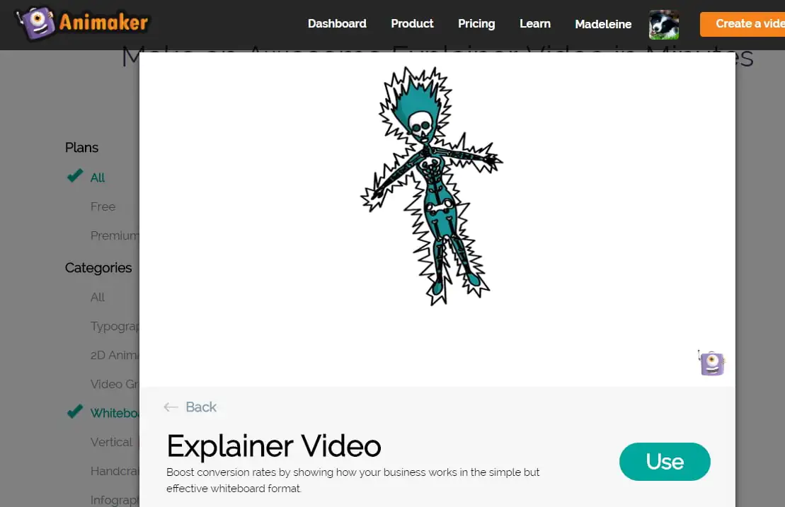 Favori animasyon şablonunuzu seçtikten sonra, videoyu oynatabilir ve son ürüne göz atabilirsiniz. Ardından kontrol panelini açmak ve animasyonu özelleştirmeye başlamak için ‘Kullan’ düğmesini tıklayabilirsiniz.