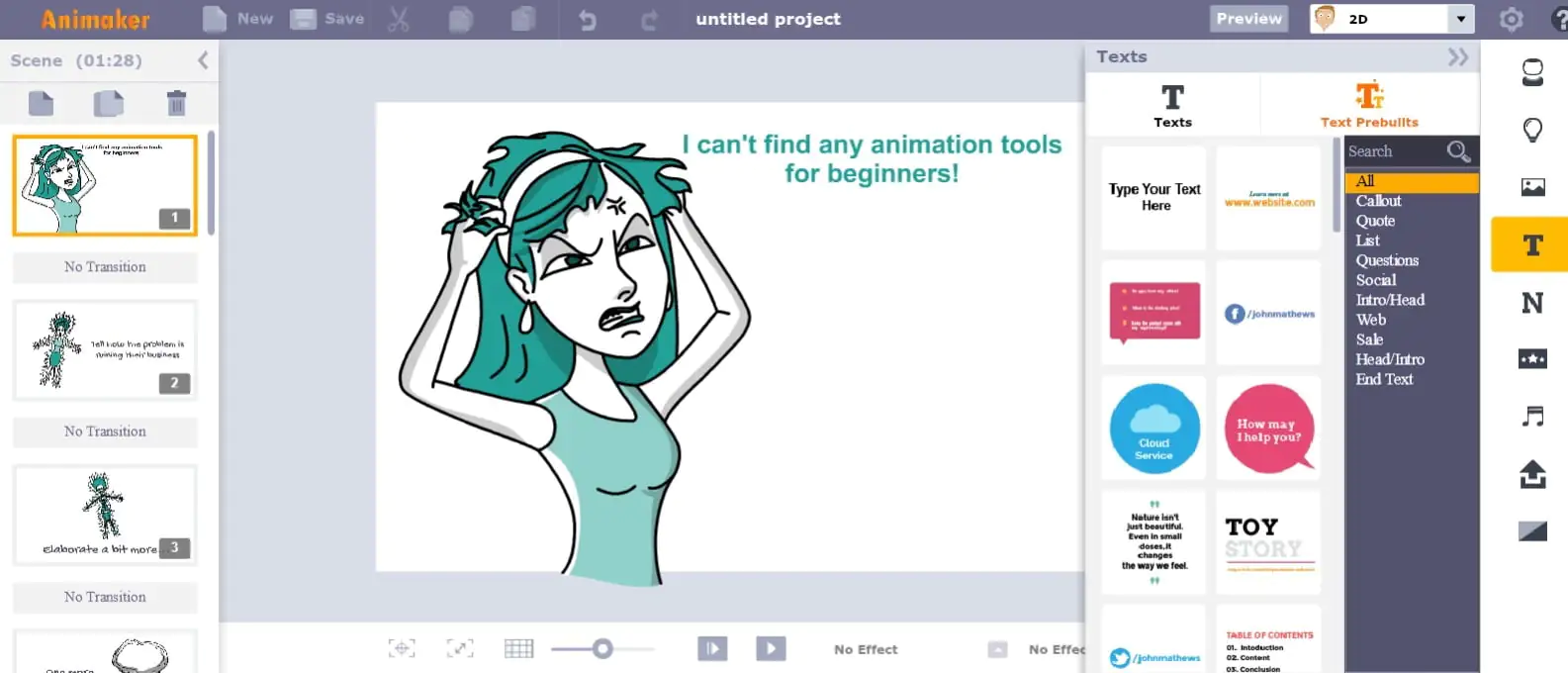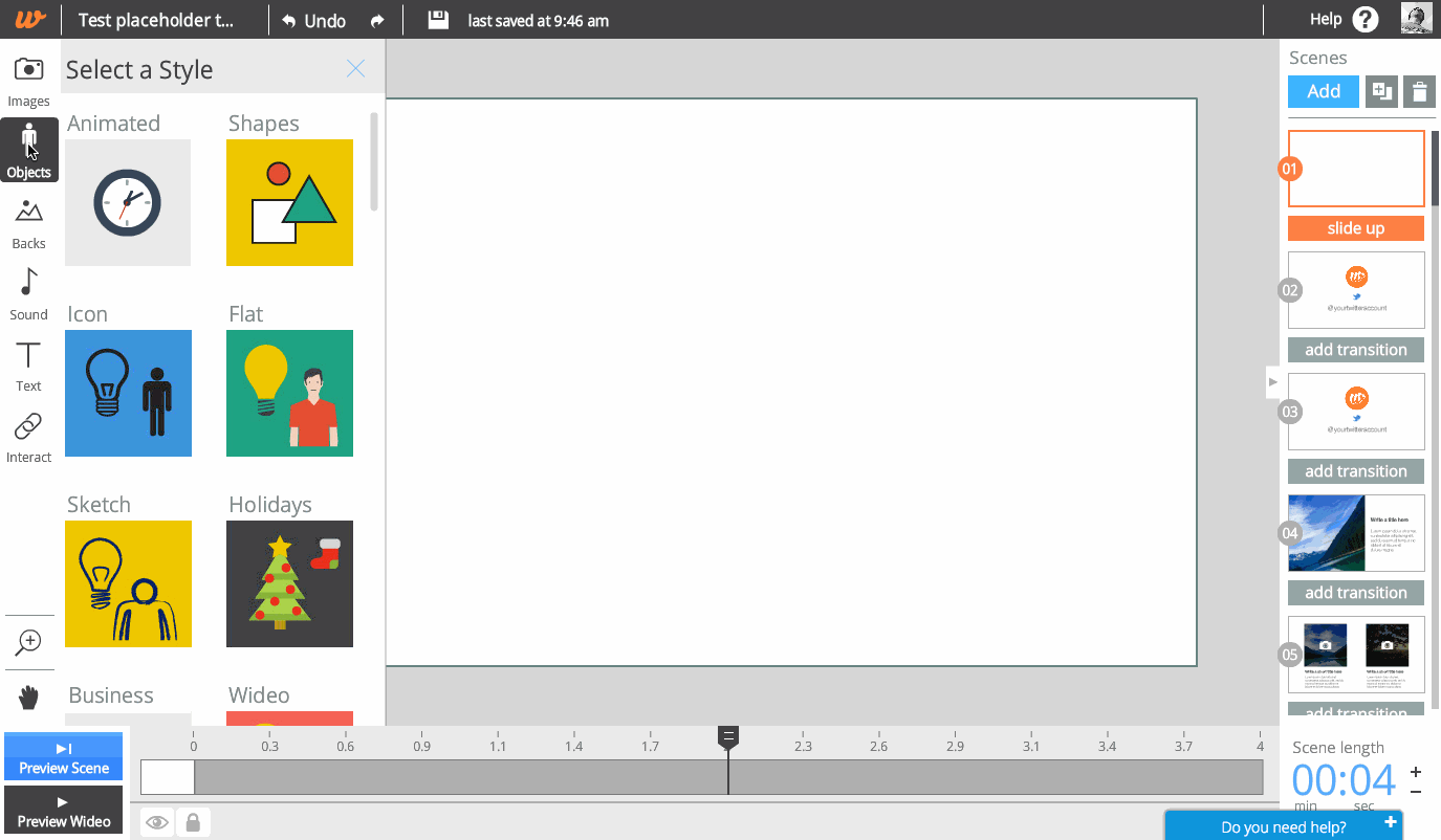 Kontrol panelinde, sahneleri ekleyebilir ve düzenleyebilir, animasyonunuzu kişiselleştirmek için metin ekleyebilir, izleyicinizin dikkatini çekmek için çeşitli animasyon efektleri ekleyebilir ve daha fazlasını yapabilirsiniz.