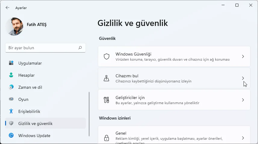 - Sol bölmede Gizlilik ve güvenliği ve ardından sağ bölmede Cihazımı bulu tıklayın.