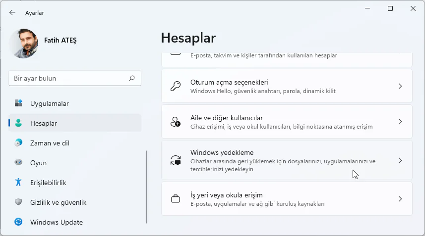 - Hesapları ve ardından Windows yedeklemesini seçin.