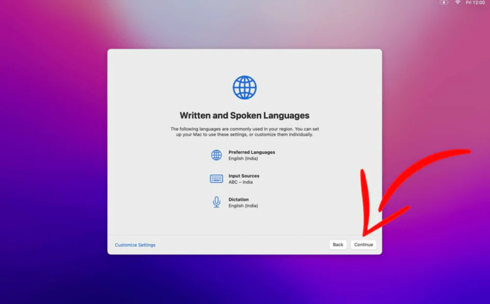 Sırada, Yazılı ve Sözlü Diller sayfasında, Mac’inizin gösterdiği ayarları kabul eder, veya sol alt taraftaki ‘ Ayarları Özelleştir ‘ düğmesini seçerek her bir ayarı düzenleyin.