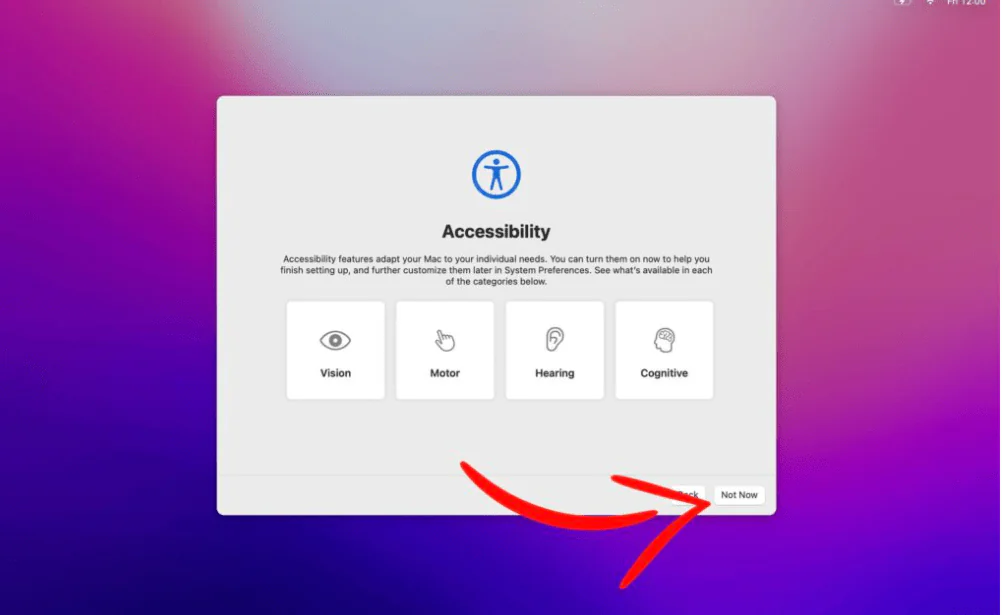 Bununla işiniz bittiğinde, Erişilebilirlik sayfasını göreceksiniz. Verilen işlevlerle ilgili herhangi bir zorluk yaşarsanız, bu ekrandan Mac’inizi ihtiyaçlarınıza göre ayarlayabilirsiniz. Değilse, ‘ Şimdi değil’e dokunun ve sonraki ekrana gidin.