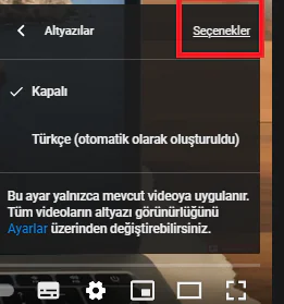 5)Sizleri karşılayan yeni pencereden ise altyazılar menüsünün sağ tarafında yer alan seçenekler menüsüne tıklayın.