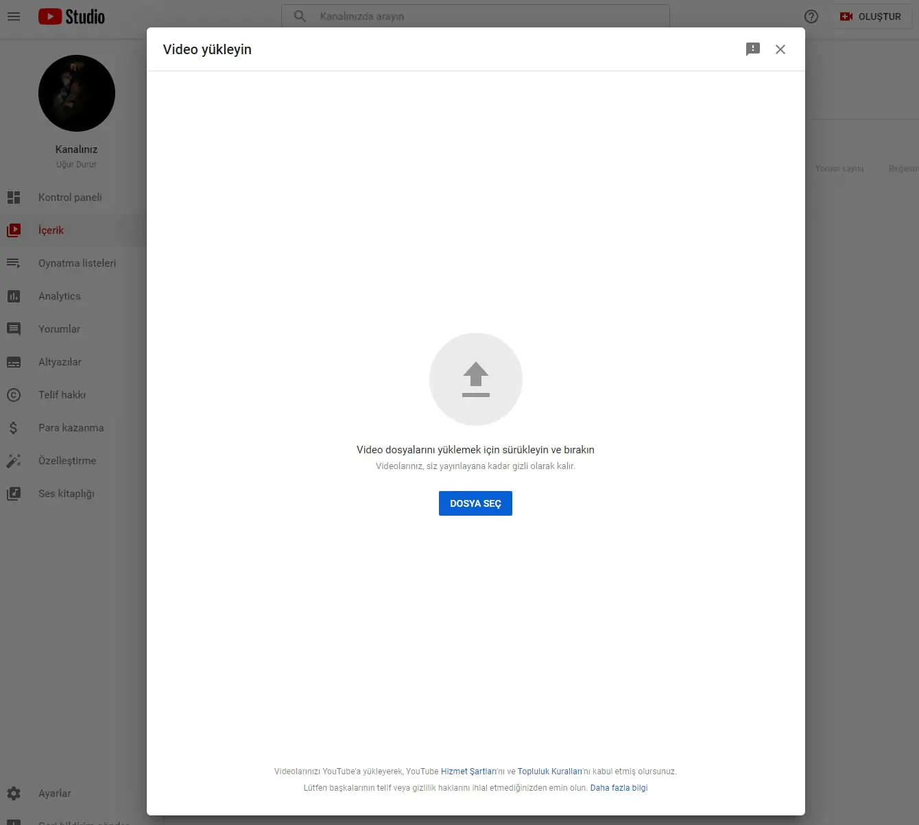 Açılan ekrana yüklemek istediğimiz dosyayı sürükle bırak yaparak yükleyebiliriz. Veya dosya seç diyerek dosyamızı yükleyebiliriz.