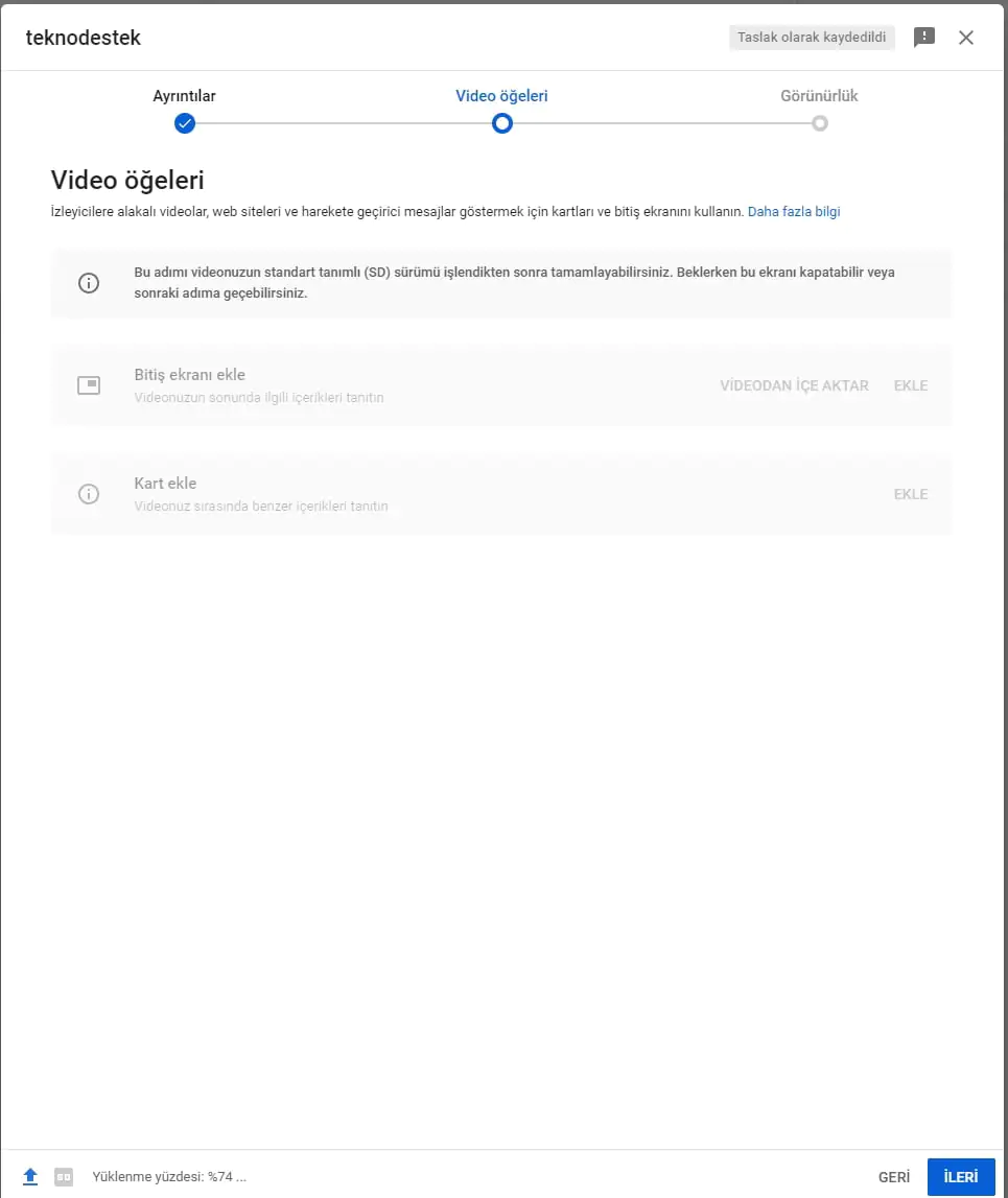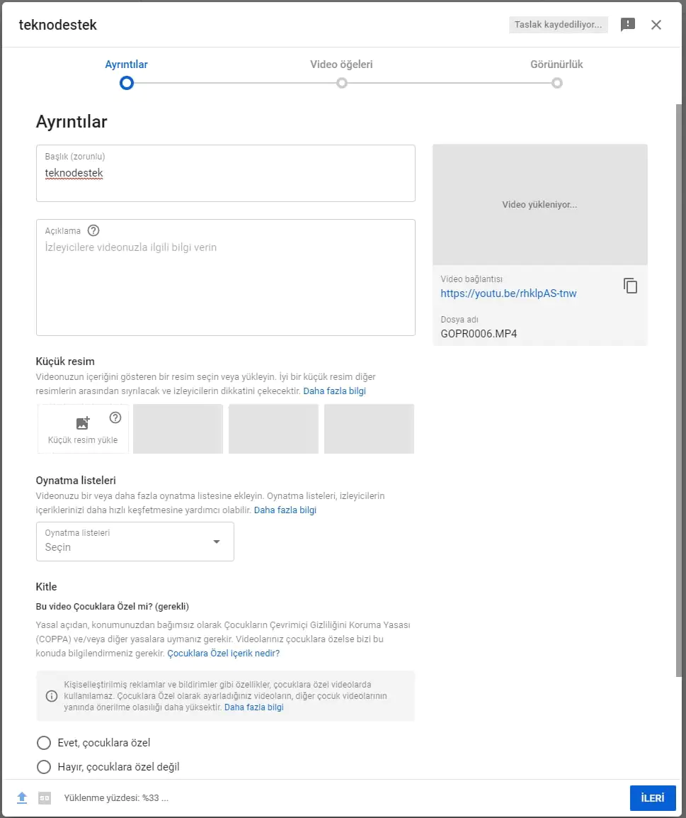Dosyamızı yükledikten sonra videomuza bir isim veriyoruz. Çocuklara özel veya değilse bunun seçimini yapıyoruz ve ileri diyoruz