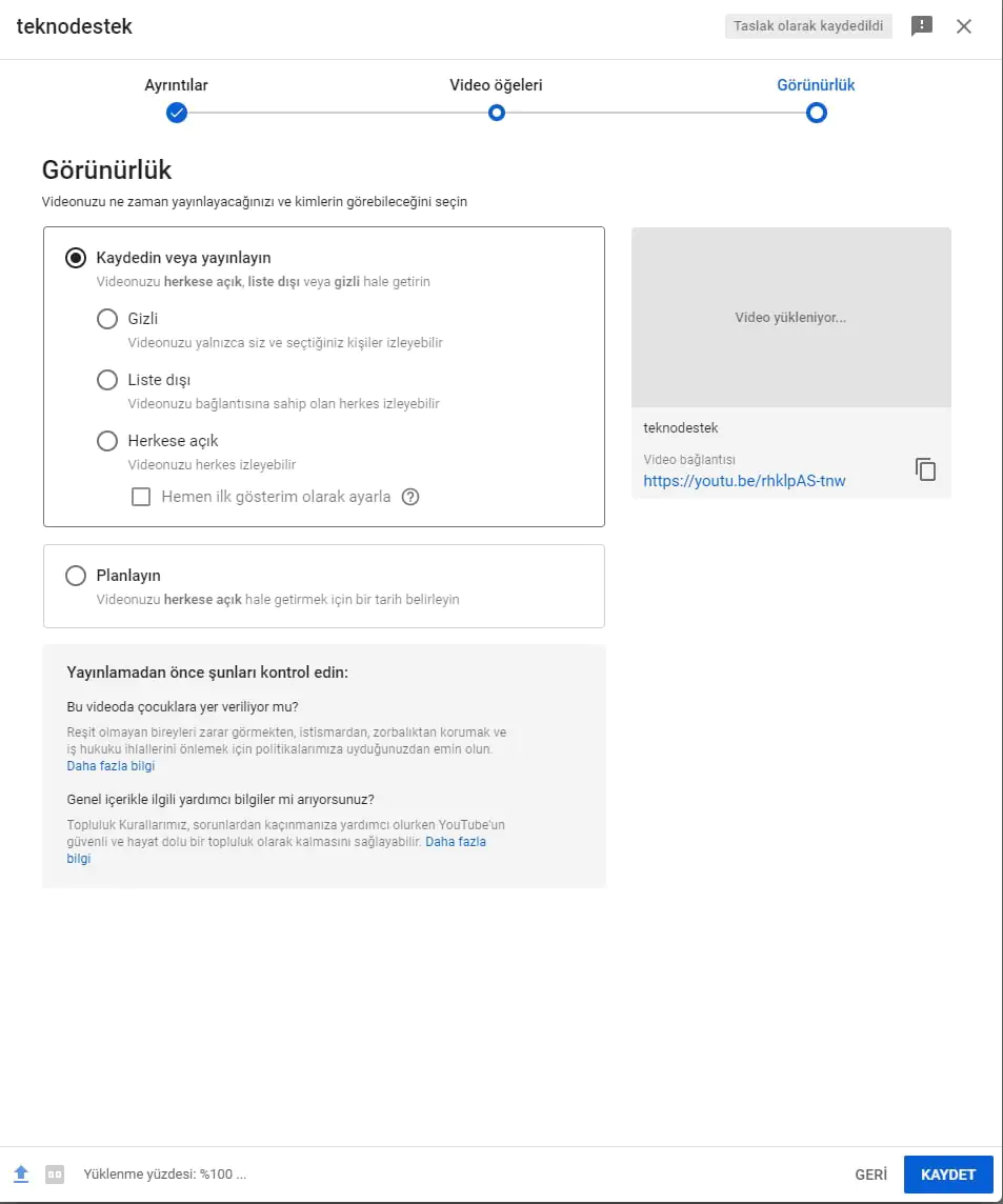 Son olarak paylaşımını yapacağımız videonun gizlilik ayarlamalarını yapıyoruz. Kaydet dedikten sonra yayınla kısmı gelecektir yayınla diyerek videomuzu yüklemiş oluyoruz.