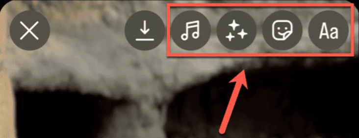 - Ekranın üst kısmındaki butonları kullanarak sesi açıp kapatabilir, metin, çıkartma, müzik veya efekt ekleyebilirsiniz.