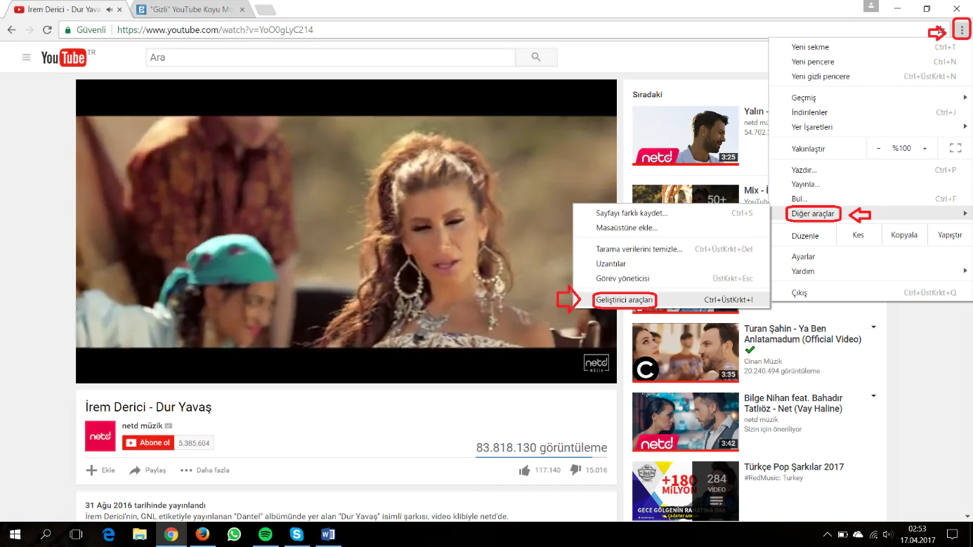 - İlk önce Google Chrome‘da bulunan 3 nokta simgesine tıklayalım ve açılan menü listesinden Diğer araçlar menüsüne tıklayalım. Sonrasında açılan menü listesinde ise Geliştirici araçları menüsüne tıklayalım; aşağıdaki resimde de belirtildiği gibi.