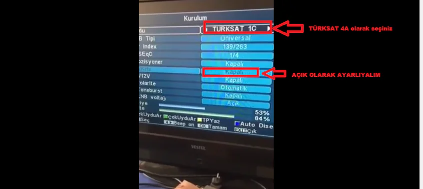 • Açılan kurulum ekranında, Uydu kısmında TÜRKSAT 4A seçeneğini seçelim. Hz kısmı kapalı ise Açık olarak ayarlayalım.