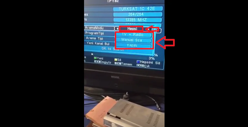 • Arama modunu Hepsi yapalım. Program Tipi kısmında TV+Radio seçelim. Arama Tipi kısmını da Manual Sca olarak ayarlayalım.