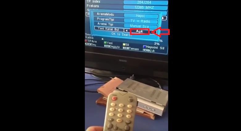 • Ve Yeni Kanal Bul seçeneğini de Açık olarak ayarladıktan sonra OK to Search yazısının üzerine gelip, uydu alıcı kumandasından OK butonuna basalım ve kanal arama işlemini başlatalım.