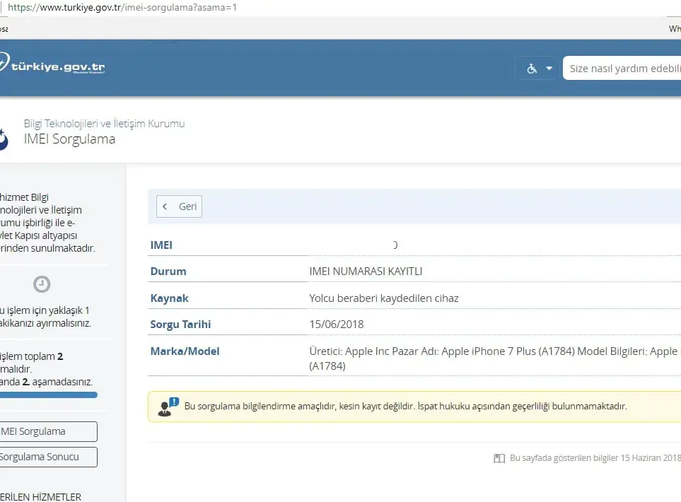 İlgili ekranları tamamlamanızın ardından IMEI kayıt işleminiz başarılı şekilde gerçekleştirilecektir. İşlem sonrasında kaydın başarılı olup olmadığını https://www.turkiye.gov.tr/imei-sorgulama?asama=1  adresinden kontrol edebilirsiniz. Kayıt işlemi başarılı oldu ise, sorgulama ekranlarında Yolcu Beraberinde Kaydedilen IMEI olarak görünecektir.