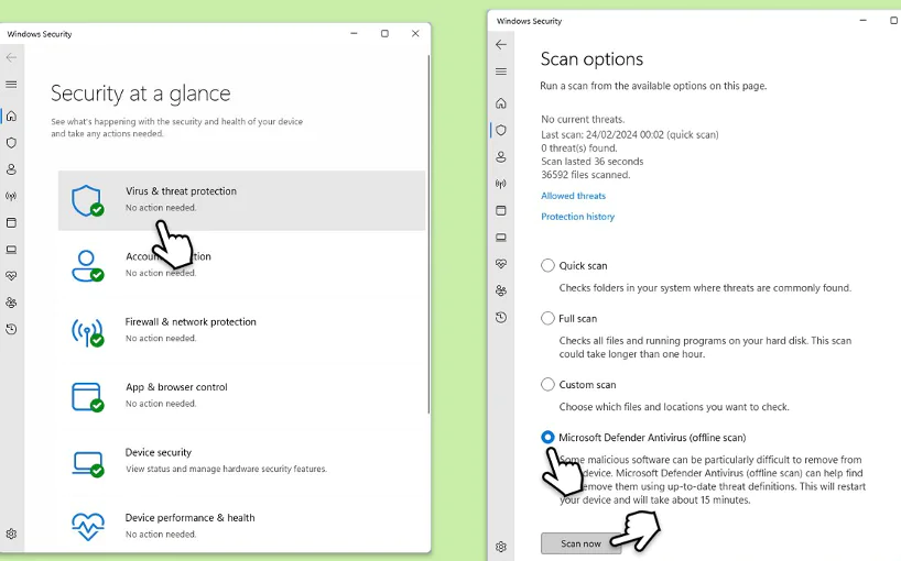- Microsoft Defender Çevrimdışı tarama seçeneğini seçin ve Şimdi tara düğmesine tıklayın.