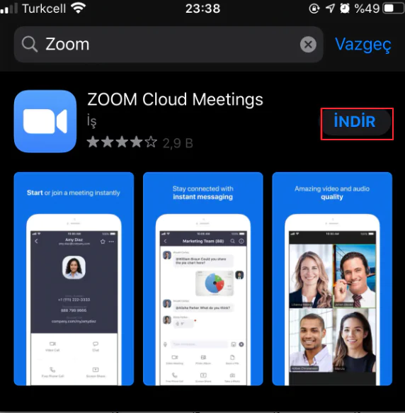 Öncelikle telefonunuzun uygulama mağazasına girip uygulama arama kısmına ZOOM yazarak aratalım. Arama sonuçlarında ZOOM Cloud Meetings indirelim.