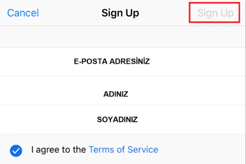 Bilgilerini yazarak “I agree to the Terms of Service” yazısının başındaki kutucuğu tıklayalım. Ve Sign Up tıklayarak devam edelim.