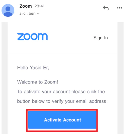 E-posta kutumuza ZOOM tarafından gelen e-postayı açıp “Activate Account” tıklayıp onaylıyoruz.