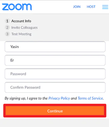 Bu kısımda açtığımız hesaba bir şifre oluşturmamız isteniyor. Bu şifrede, büyük, küçük harf ve rakamlardan oluşması gerekiyor. Şifre uzunluğu en az 8 karekter olarak belirlenmesini istemektedir. Sonrasında kaydınızı tamamlamak için “Continue” tıklayo devam edelim.