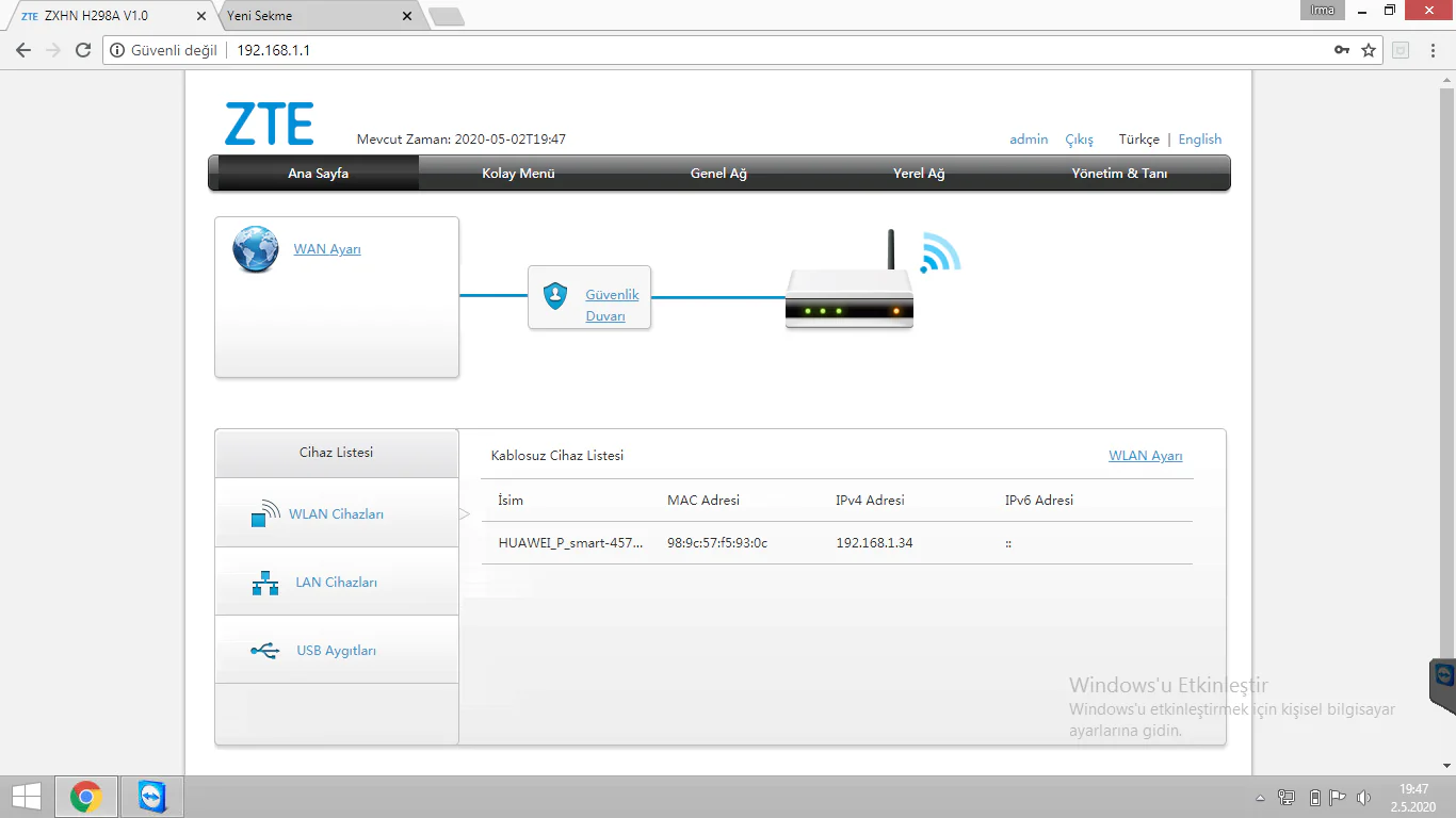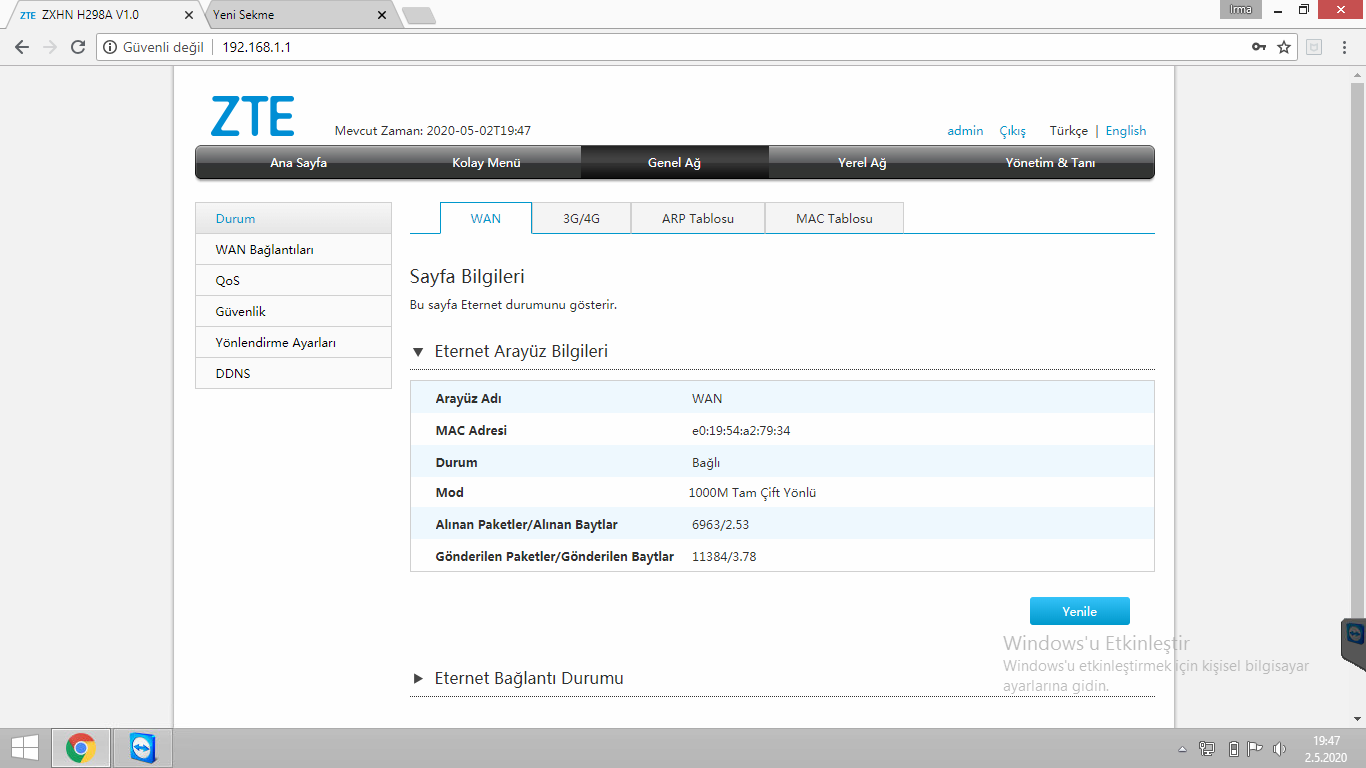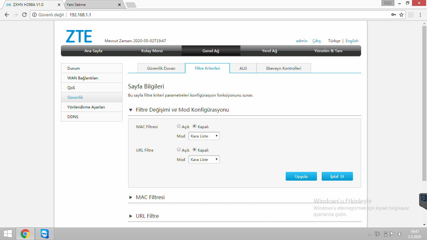 Zte bir çok teknoloji alanında olduğu gibi modem kısmında da uzun yıllardır hizmet vermekte . En son üretimlerden biri olan zte 298a modeli modem de nasıl mac filitreleme yapılacağını anlatacağız.öncelikle modem arayüzüne girmemiz gerekiyor internet tarayıcısı açıp adres satırına 192.168.1.1 yazıyoruz Karşımıza gelen  Kullanıcı adı şifre kısmına admin  yazıyoruzZte 298a Modemde Mac Filtreleme Şifre değiştirmemizi isteyen bir ekran geliyor burdan geç diyerek devam ediyoruz Ardından modem arayüzü açılmış oluyor bu kısımda sol tarafta bulunan wlan ve Lan  cihazlarından bağlı olan cihazları görüş mac adreslerini  not edebilirisiniz. Genel ağ kısmına tıklıyoruz . burdan sol tarafta bulunan güvenlik kısmına tıklıyoruz