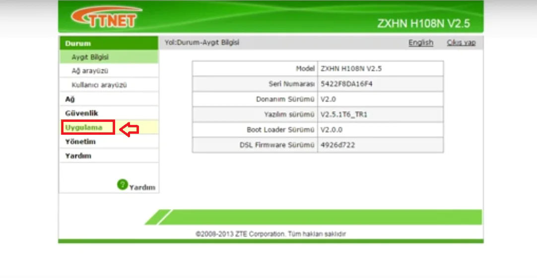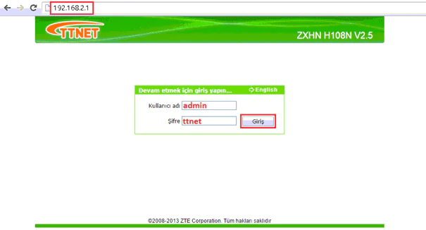 - Açılan sayfada Kullanıcı adı : admin, Şifre : ttnet yazarak Giriş butonuna tıklayalım.