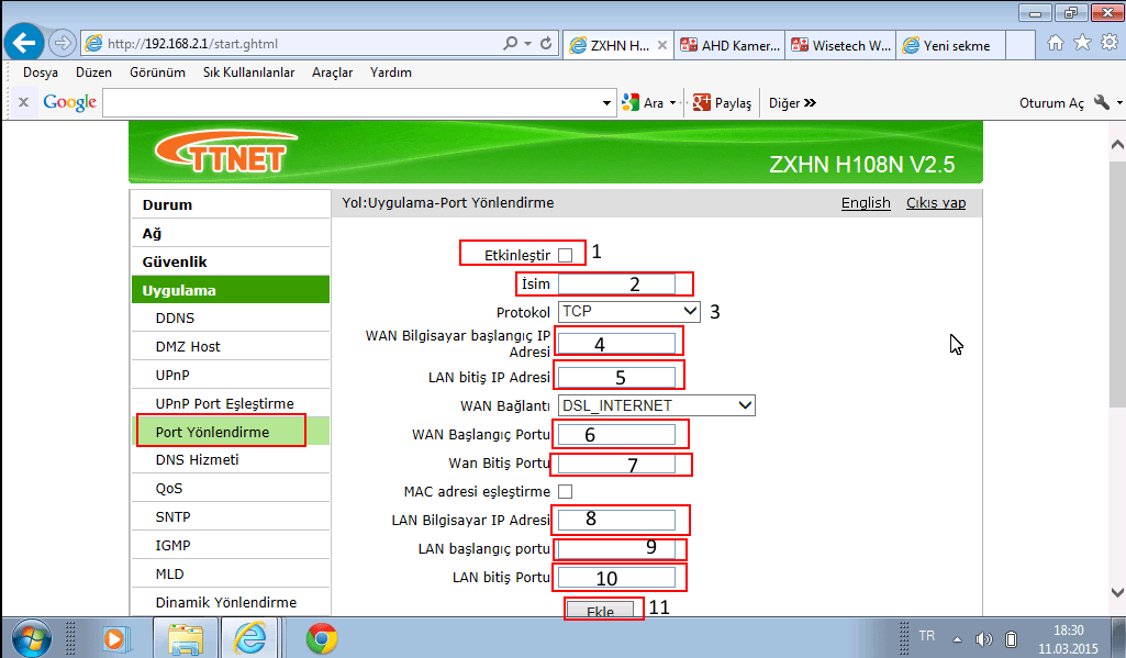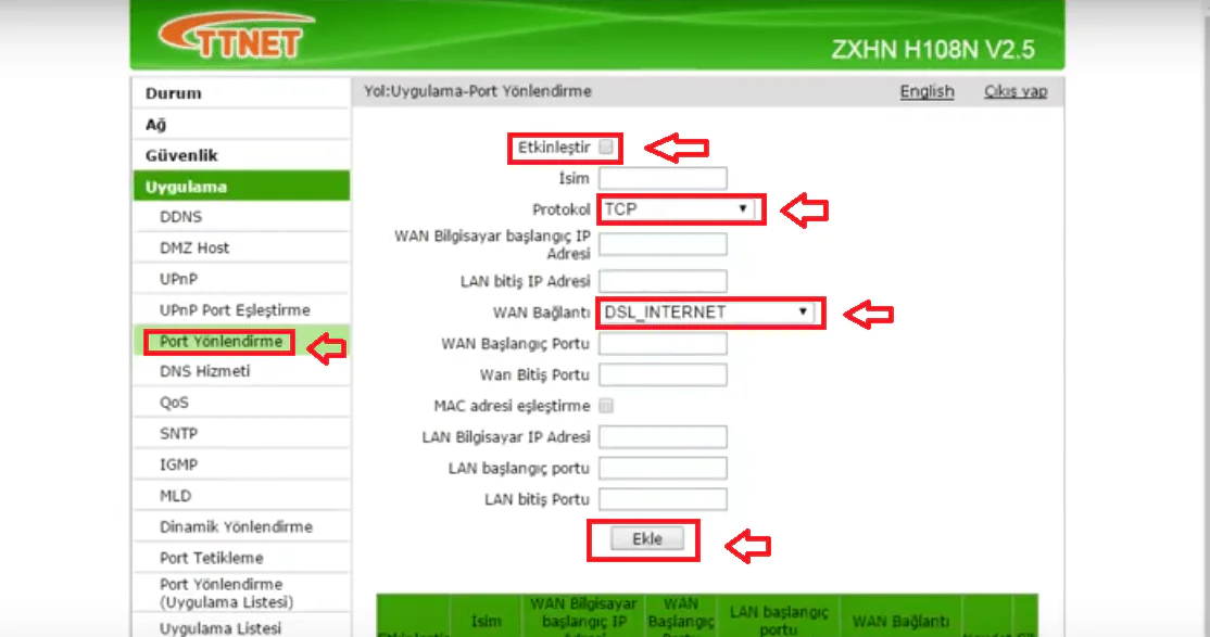 - “Uygulama” menüsü altındaki alt menülerden Port Yönlendirme‘ye tıklayalım. Bu sayfada, açacağımız her port için kural oluşturacağız. Öncelikle “Etkinleştir” kutucuğunu seçelim. “İsim” kısmına port yönlendirme yapacağınız cihaza uygun bir isim yazabilirsiniz; DVR cihazi için yönlendirme yapıyorsanız, kamera-1 yazabilirsiniz. Protokol kısmında TCP seçelim. WAN Bilgisayar başlangıç IP Adresi kısmı boş olacak. LAN bitiş IP Adresi boş olacak. WAN Bağlantı kısmı DSL_İNTERNET olacak. WAN Başlangıç Portu ve WAN Bitiş Portu kutucuklarına, yönlendirme yapacağımız port numarasını (örn: 8080) girelim. LAN Bilgisayar IP Adresi kısmına ise yönledirme yapacağımız cihazın yerel sabit IP adresini giriyoruz (örn: 192.168.2.2). LAN başlangıç portu ve LAN bitiş portu kutucuklarına, yine yönlendirme yapacağımız port numarasını giriyoruz (örn: 8080). Son olarak Ekle butonuna tıklayalım tıklayalım. Bu şekilde ilk port için yönlendirme kuralını oluşturduk. Aynı işlemi diğer port numarları için de yapacaksınız. Sadece, WAN Başlangıç Portu, WAN Bitiş Portu, LAN başlangıç portu, LAN bitiş portu kutucuklarına yazacağını yeni port numarası farklı olacak. Diğer kısımlar değişmeyecek.