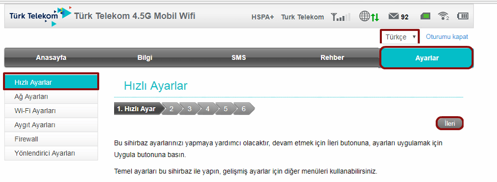 - Modem içerisine giriş yaptığınızda sağ üst köşedeki Ayarlar seçeneğine tıklayınız ve ardından sol bölümde Hızlı Ayarlar seçeneğine tıklayınız.