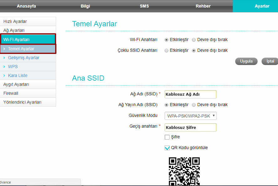 - İsterseniz bu bölümü, sol köşede yer alan Wİ-Fi Ayarları menüsü üzerinden de yapılabilirsiniz. Temel Ayarlar seçeneği üzerinden Ağ Adı olarak geçen bölüme Türkçe karakter içermeyecek şekilde yeni kablosuz ağ adınızı yazınız.