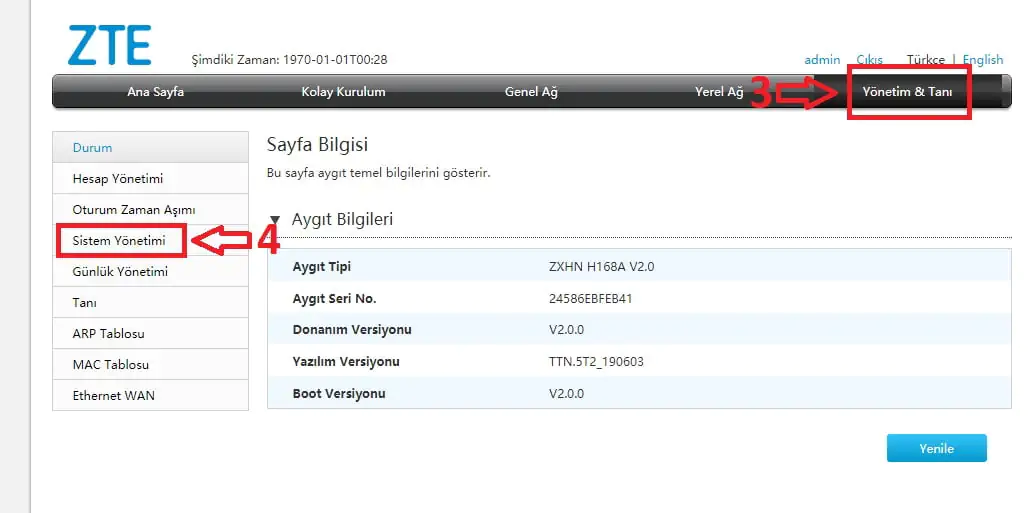 Sonrasında ise arayüz ekranlarında bulunan önce Yönetim&Tanı bölümüne, ardından ise bu ekranda bulunan Sistem Yönetimi bölümüne giriyoruz.
