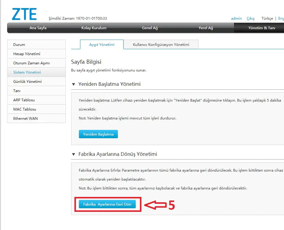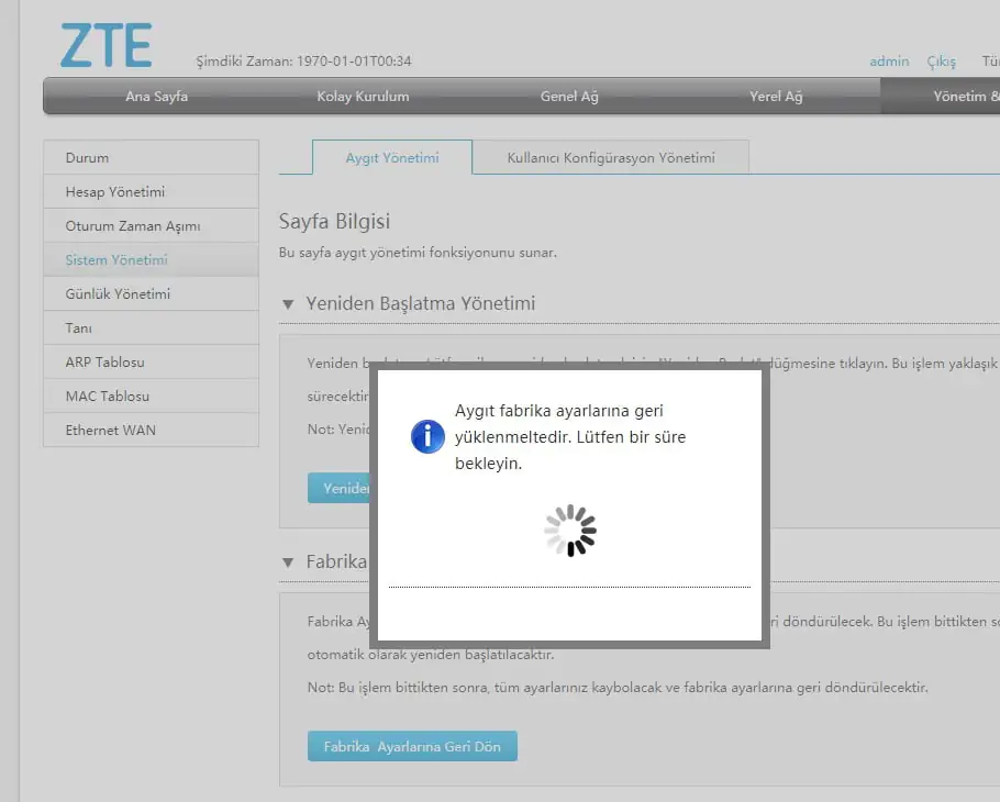 Son olarak ise menüde bulunan Fabrika Ayarlarına Geri dön tuşuna basarak modem sıfırlama işlemimizi tamamlıyoruz. Bu işlemin ardından modemimiz 180 saniye içerisinde kendisini fabrika ayarları moduna alarak içerisinde bulunan tüm bilgileri silecektir. Bu işlem her ne kadar sistem üzerinden var olan hataların silinerek, hızlanması adına faydalı olsa da, modem üzerinde yer alan güvenlik kamerası portları, yazıcı ayarları gibi kriterlerin göz önünde bulundurularak bu işlemin yapılması kullancılar adına daha faydalı olacaktır.