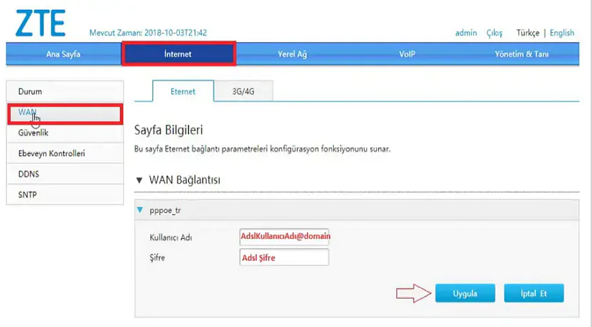 - Gelen ekranda ‘WAN Bağlantısı’ başlığı altından bulunan ‘Kullanıcı adı’ ve ‘Şifre’ kutucuklarına internet servis sağlayıcınızın sizlere vermiş olduğu ADSL/VDSL bilgilerini yazıyoruz.