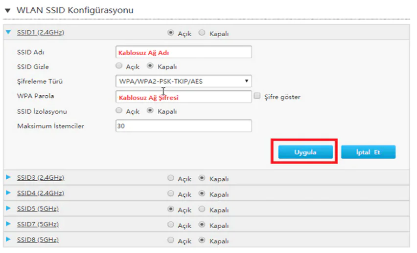 - Gerekli bilgileri girdikten sonra ‘Uygula’ butonuna tıklayıp, kablosuz ağ ayarlarımızı yapılandırıyoruz.