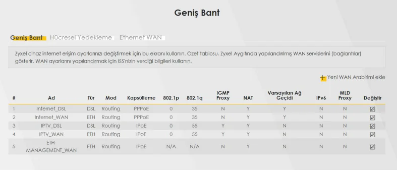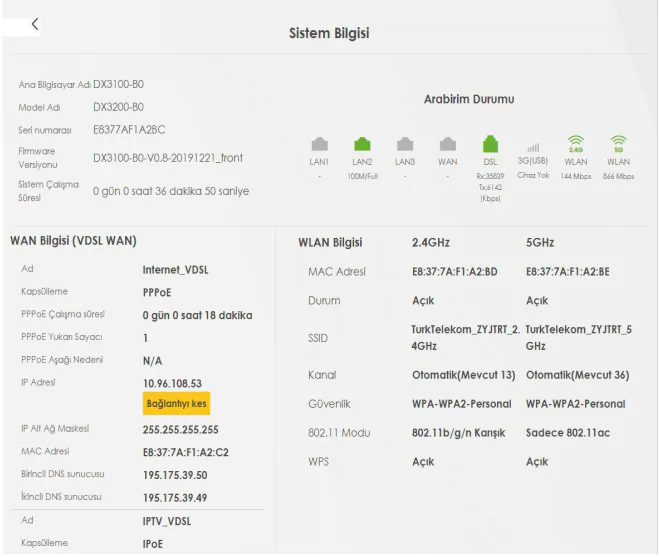 Sistem bilgisi sayfasında WAN bilgisi altında İnternet ve IPTV PVC’sinin bilgileri görülmektedir. IPTV için IP adresi görüyorsanız modeminiz IPTV PVC üzerinden yayın alabilecek demektir. Burada IP adresi görmenize rağmen IPTV yayını alamıyorsanız internet servis sağlayıcınızın çağrı merkezi (444 1 444) ile görüşmeniz gerekmektedir.
