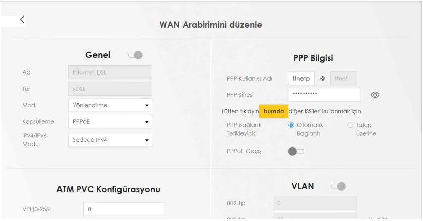 Elinizdeki belgede VDSL/ADSL kullanıcı adı kısmında ttnet’ten farklı bir serviste kullanıyor olabilir. Yukarıdaki ekran görüntüsünde olduğu gibi devam ediniz.