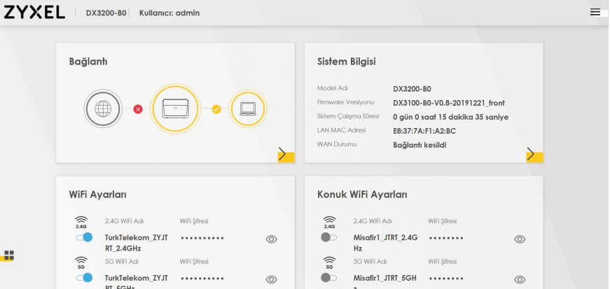 Zyxel 11AX modeminizin 2.4G ve 5G kablosuz ağ adı (SSID) ve kablosuz güvenlik şifresi her modem için farklı olmasına rağmen kablosuz ağ adı (SSID) ve kablosuz güvenlik seviyesi/şifresi değerlerinizi kendi belirlediğiniz değerlerle değiştirebilirsiniz.