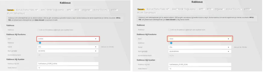 Zyxel 11AX modeminizin WEB arayüzünde ana menüde yan tarafta bulunan paneldeki “Ağ Ayarları” bölümünden “Kablosuz” linkine tıklayınız. “Kablosuz Ağ Kurulumu” kısmında değişilik yapacağınız “Bant” değeri olan 2.4Ghz veya 5Ghz seçiniz.