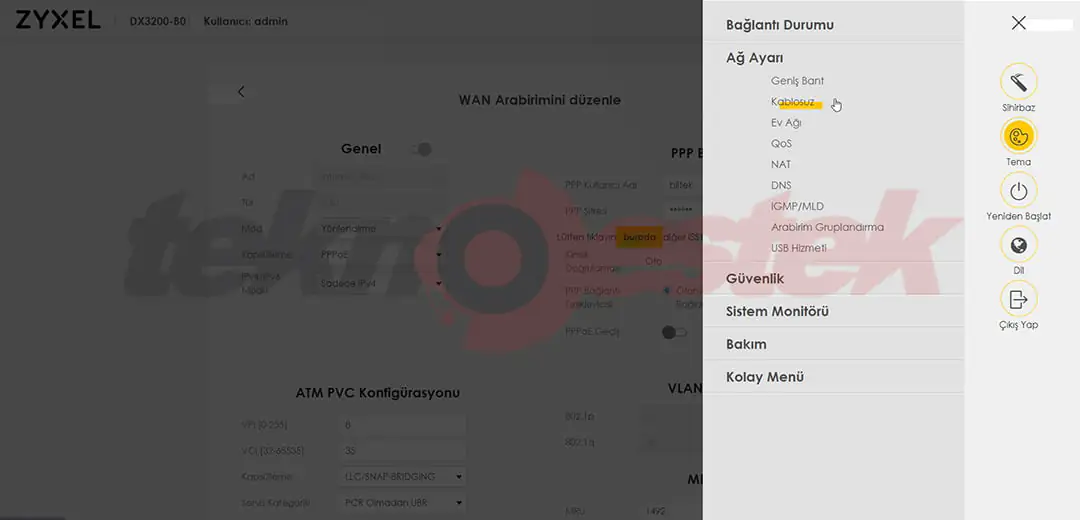Modem arayüzüne giriş yaptıktan sonra, ZYXEL DX3200-B0 modem kablosuz ayarlarını yapmak için şu adımları izleyin: