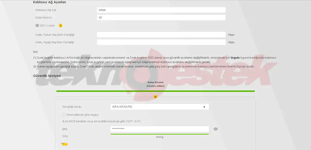 Alt kısımda yer alan Şifre alanına yeni bir Şifre oluşturabilmek için ise Otomatikman şifre oluştur yazısının tik işaretini kaldırabilir ve Şifre bölümüne Türkçe karakter içermeyen bir kablosuz güvenlik şifresi oluşturabilirsiniz.