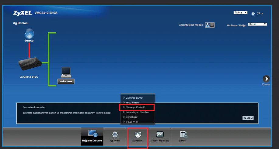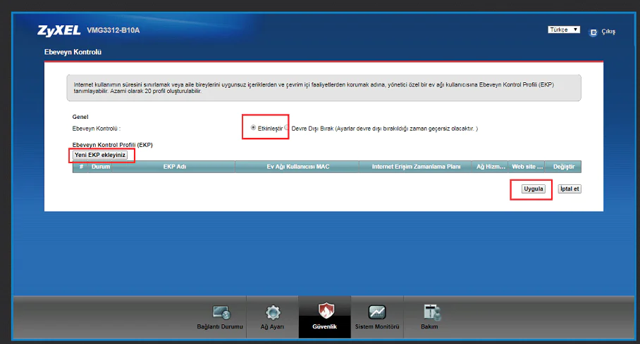 Cihaz arayüzündeki bu menülerden sırasıyla Güvenlik (Security) ⟶ Ebeveyn Kontrolü (Parental Control) menülerine tıklayınız.