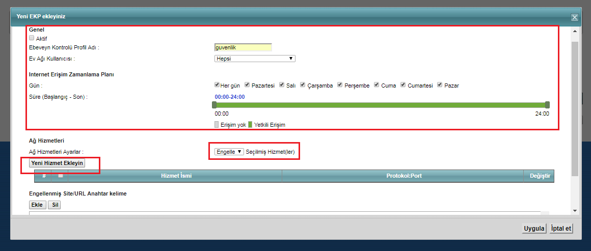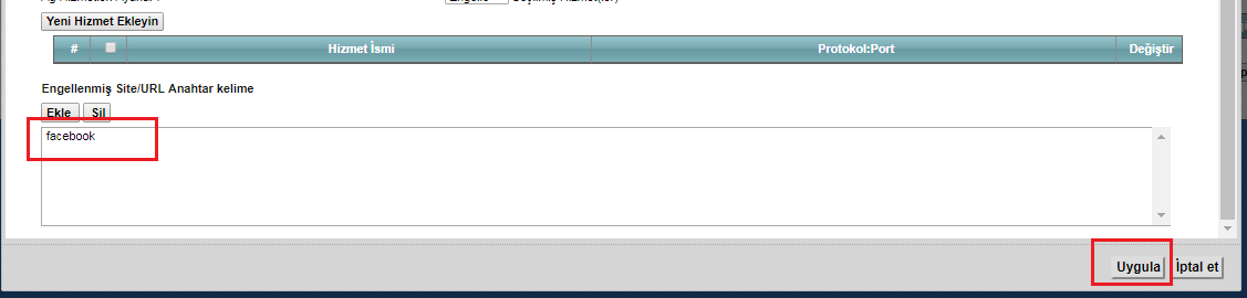 - Hizmet ekleme menüsünde, engellemek istediğiniz site URL’sini veya site ismini belirten kelimeleri göreceksiniz. ‘Uygula’ butonuna tıklayarak etkin hale getiriniz.