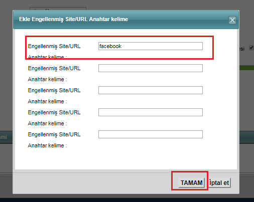 - Engellemek istediğiniz site adreslerini eklemek için, kelimeleri (örn: facebook) yazarak ‘Tamam’ butonuna tıklayınız.