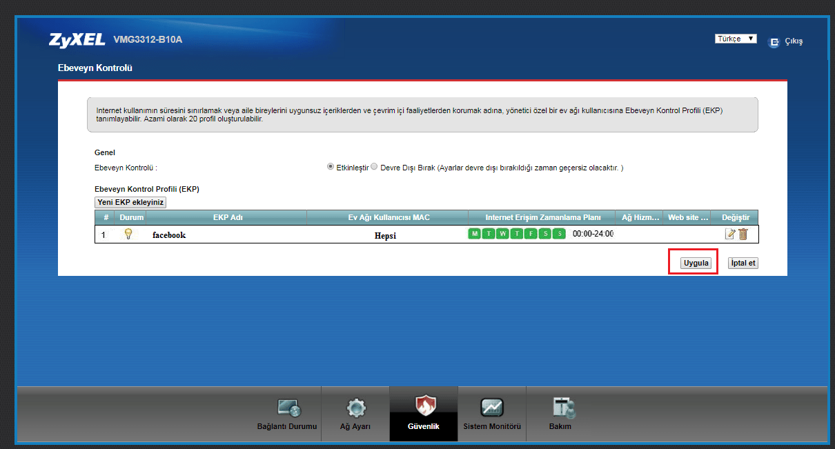 - İşlem tamamladıktan sonra aşağıdaki ekranın geldiğinden emin olunuz. Yani kuralınızın aktif ve kullanıcı erişim kontrolünüzün aktif olduğunu gördükten sonra ‘Uygula’ butonuna tıklayarak oturumunuzu kapatınız.