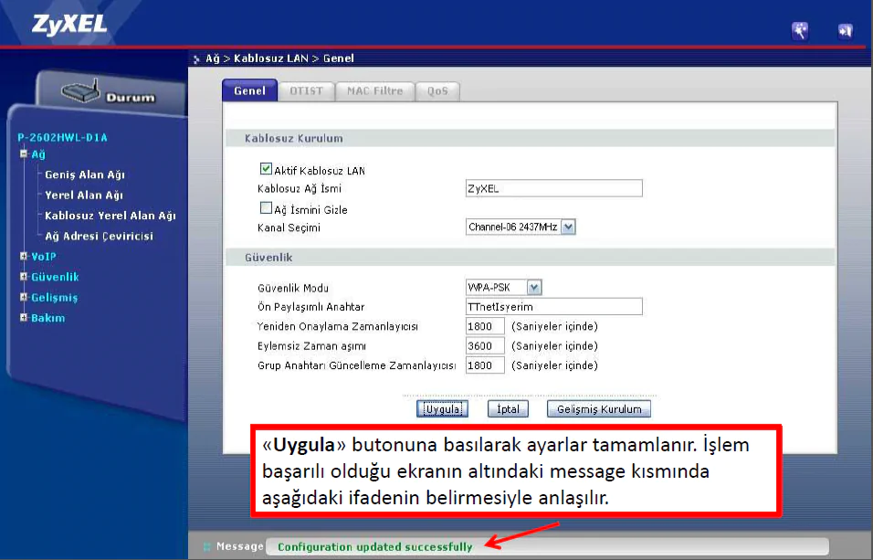 Daha sonra “Uygula” butonuna tıklayıp ayarları tamamlıyoruz. İşlemin başarı ile tamamlandığı, ekranın altındaki “message” kısmında “Configuration updated successfully” ifadesinin belirmesiyle anlaşılır.